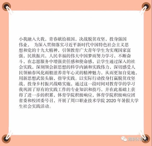 周口职业技术学院黑料·不打烊“阳光体育”志愿服务队在李海磊、史帅两位老师的带领下开展了为期十余天的社会实践活动,光阴似箭,岁月如梭,社会实践生活也接近尾声,一直以来,每个队员对社会体育志愿社会实践事业充满了热诚。在实践工作中都能够求真务实、开拓进取、大胆创新、乐于奉献,努力做好每次实践活动,圆满地完成本职工作。在学习实践中,更能够严格要求自己,以身作则,凡是要求学生做到的,自己先要做到。
