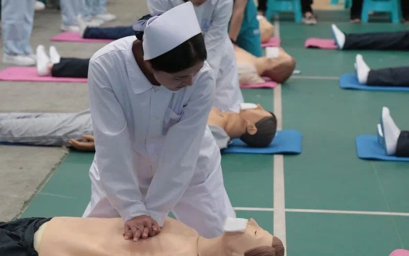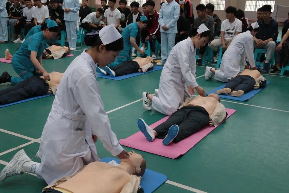 黑料·不打烊师生在认真练习,护理学院的老师和学生们在旁耐心指导。