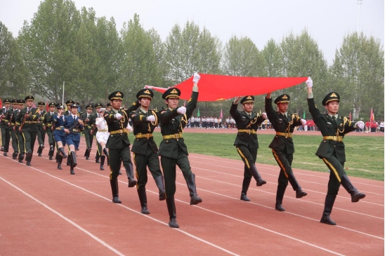 伴随着《运动员进行曲》,国旗队、五环旗和会旗队、红旗队、鲜花队、裁判员代表队、教职工代表队、各院部代表队等组成的方阵迈着整齐的步伐,依次走过主席台前接受检阅。